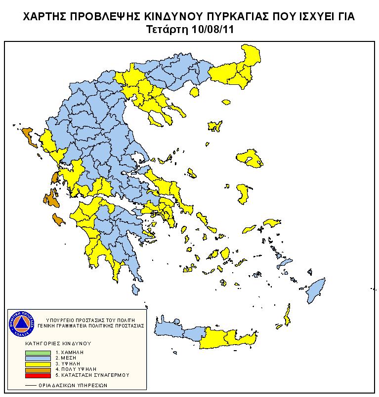Υψηλός είναι ο κίνδυνος πυρκαγιάς στη δυτική Ελλάδα, την ανατολική Κρήτη, τις Κυκλάδες, τα Δωδεκάνησα, τη νότια Αττική και το μεγαλύτερο μέρος της Εύβοιας, τα νησιά του Βορείου Αιγαίου, τις Σποράδες και τους νομούς Θεσσαλονίκης, Χαλκιδικής, Κιλκίς, Έβρου και Ροδόπης.