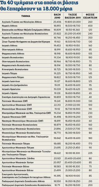 Μόλις 40 τμήματα, ορισμένα εκ των οποίων απαιτούν και εξέταση σε ειδικά μαθήματα, αναμένεται να βρεθούν στο ρετιρέ της βαθμολογίας (18-20), εξαιτίας της γενικευμένης πτώσης των βάσεων εισαγωγής, σύμφωνα με ρεπορτάζ του Έθνους.