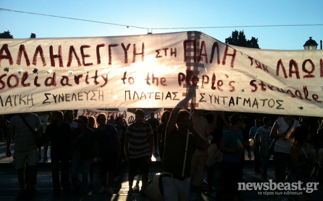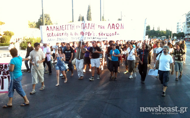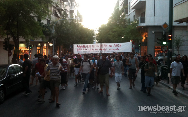 Οι διαδηλωτές, κρατώντας πανό όπου αναγράφονται συνθήματα όπως «Ειρήνη Αλληλεγγύη στην πάλη των λαών», «Κάτω ο φασισμός», «Το Σύνταγμα ανήκει στο λαό», εκφράζουν τη συμπαράστασή τους στο βρετανικό λαό που εδώ και τέσσερις μέρες διαδηλώνει με αφορμή τη δολοφονία του 29χρονου Μάρκ Ντάγκαν.