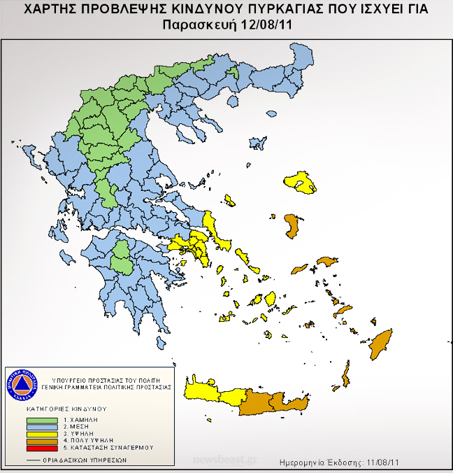 Σύμφωνα με τον Χάρτη Πρόβλεψης Κινδύνου Πυρκαγιάς που εκδίδει η Γενική Γραμματεία Πολιτικής Προστασίας προβλέπεται πολύ υψηλός κίνδυνος πυρκαγιάς στο βόρειο και νότιο Αιγαίο και στους νομούς Ηρακλείου και Λασιθίου στην Κρήτη.