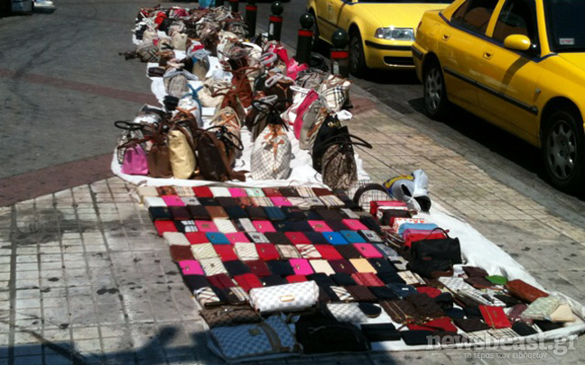 Οι φωτογραφίες που βλέπετε, είναι έξω από τη στάση μετρό Αγίου Δημητρίου. Εκεί οι μετανάστες έχουν στήσει πάγκους με τα μαϊμού προϊόντα: από τσάντες και γυαλιά που είναι τα συνηθέστερα είδη προς πώληση μέχρι αθλητικά παπούτσια και είδη ρουχισμού.