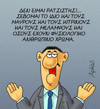 «Δεν είμαι ρατσιστής!… Σέβομαι το ίδιος και τους μαύρους και τους κίτρινους και τους μελαμψούς και όσους έχουν φυσιολογικό χρώμα», παρατηρεί ο γνωστός σκιτσογράφος.