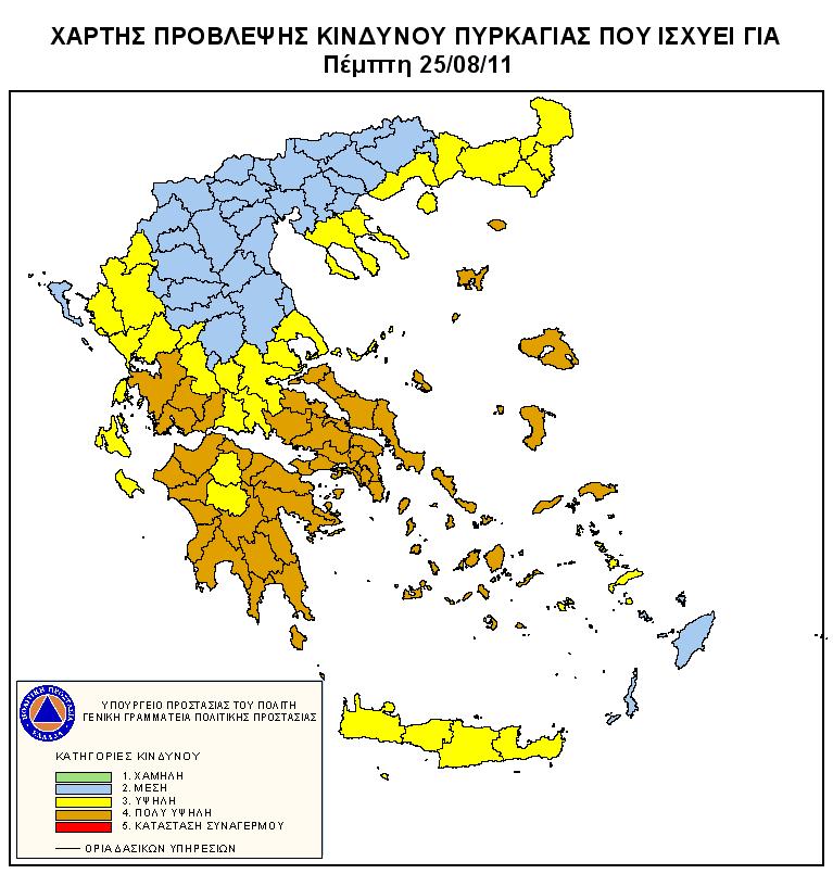 Στην κατηγορία κινδύνου 4 για εκδήλωση πυρκαγιάς βρίσκονται σήμερα πολλές περιοχές της χώρας με τους ισχυρούς ανέμους να φτάνουν τοπικά και τα 8 μποφόρ. Σύμφωνα με τον χάρτη πρόβλεψης κινδύνου πυρκαγιάς που εκδίδει η Γενική Γραμματεία Πολιτικής Προστασίας προβλέπεται πολύ υψηλός κίνδυνος πυρκαγιάς για τις Περιφερειακές Ενότητες: