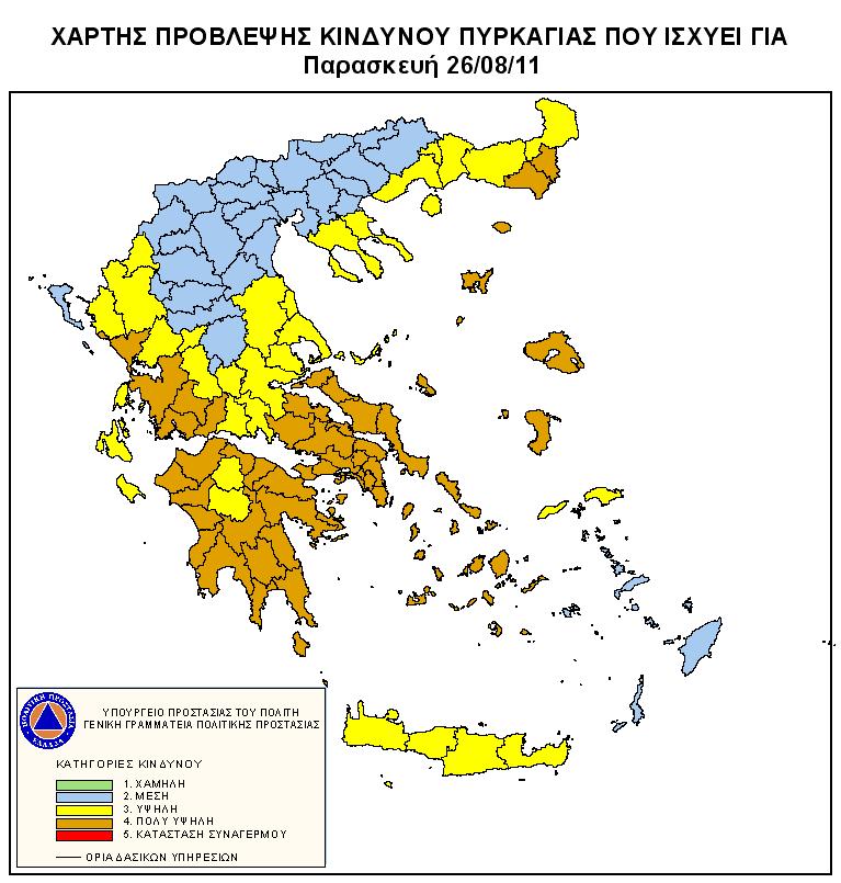 Πολύ υψηλό κίνδυνο πυρκαγιάς αντιμετωπίζουν και σήμερα πολλές περιοχές της χώρας λόγω των ισχυρών ανέμων 8 μποφόρ. Σύμφωνα με τον Χάρτη Πρόβλεψης Κινδύνου Πυρκαγιάς που εκδίδει η Γενική Γραμματεία Πολιτικής Προστασίας στην κατηγορία κινδύνου 4 για εκδήλωση πυρκαγιάς κατατάσσονται οι παρακάτω περιφερειακές ενότητες: