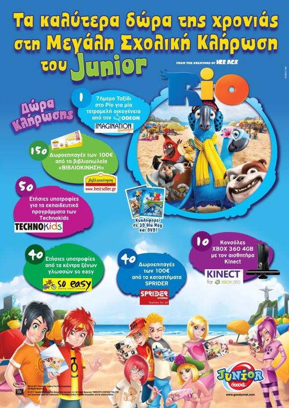 Δωροεπιταγές 100 ευρώ από τη «Βιβλιοκίνηση», ετήσιες υποτροφίες από τα «TechnoKids» και «So Easy», Δωροεπιταγές 100 ευρώ από τα «Sprider Stores», Κονσόλες «X-BOX 360 με τον αισθητήρα Kinect» αλλά και μία εντυπωσιακή, αξέχαστη εμπειρία: με αφορμή το λανσάρισμα της αγαπημένης ταινίας «Rio» σε DVD, οι καταναλωτές έχουν τη μοναδική ευκαιρία να κερδίσουν ένα οικογενειακό επταήμερο ταξίδι στο Ρίο ντε Τζανέιρο της Βραζιλίας!