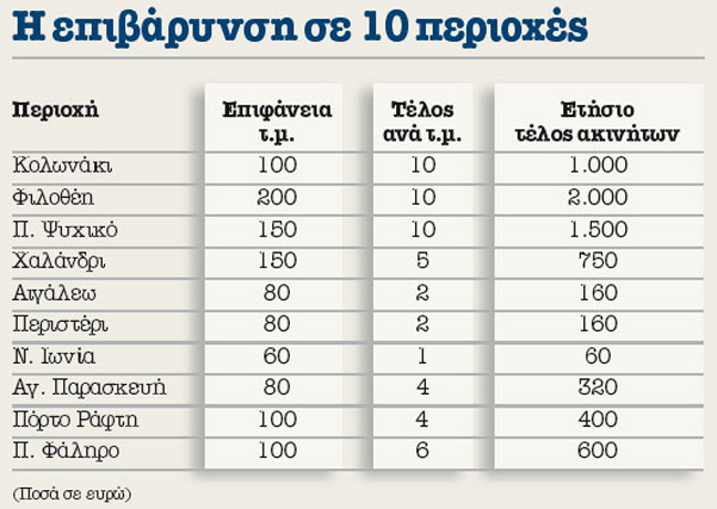 Ετσι για παράδειγμα στη Νέα Ιωνία, όπου η τιμή ζώνης είναι κάτω από 1.000 ευρώ το τ.μ., το τέλος υπολογίζεται ότι θα διαμορφωθεί στο 1 ευρώ το τ.μ. και συνεπώς ο ιδιοκτήτης κατοικίας 60 τ.μ. θα κληθεί να καταβάλει για το 2011 ποσό 60 ευρώ. Στο Αιγάλεω και το Περιστέρι το τέλος ανά τ.μ. εκτιμάται ότι θα διαμορφωθεί στα 2 ευρώ και έτσι για κατοικία 80 τ.μ. θα ανέλθει στα 160 ευρώ. Στην Αγία Παρασκευή το τέλος αναμένεται να διαμορφωθεί στα 4 ευρώ ανά τ.μ. και έτσι για διαμέρισμα 80 τ.μ. θα είναι 320 ευρώ, ενώ στα ακριβά σημεία του Χαλανδρίου θα είναι 5 ευρώ το τ.μ. και συνεπώς για διαμέρισμα 150 τ.μ. θα ανέρχεται στα 750 ευρώ.