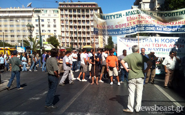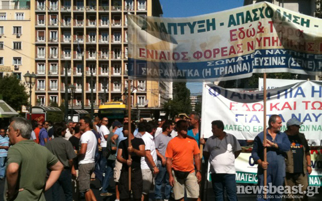 Περίπου 500 άτομα που εργάζονται στα ναυπηγεία Ελευσίνας διαμαρτύρονται αυτήν την ώρα έξω από το υπουργείο Οικονομικών, καθώς τον τελευταίο χρόνο η κυβέρνηση απαξιώνει και αδιαφορεί για τα προβλήματα τους, ενώ καταγγέλλουν ότι δεν έχουν πληρωθεί τους τελευταίους 4 μήνες.