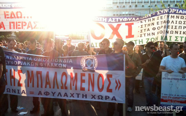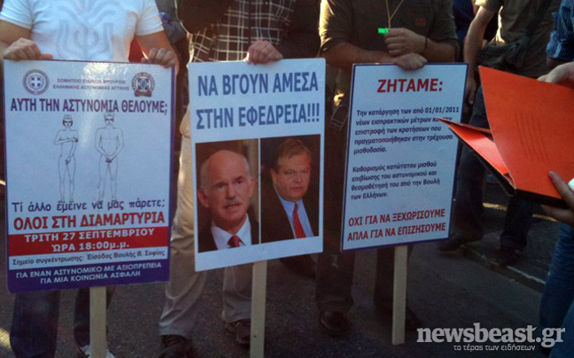 Περίπου 2.000 αστυνομικοί είναι συγκεντρωμένοι αυτή τη στιγμή έξω από τη βουλή ενώ έντονα είναι τα αντικυβερνητικά συνθήματα με τα οποία καταγγέλλουν την οικονομική εξαθλίωση και την μείωση των μισθών που τους έχουν επιβάλλει με το Μνημόνιο.