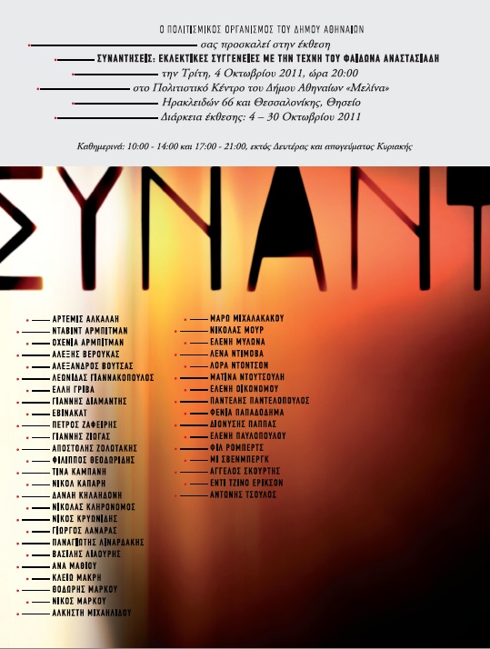 Τα έσοδα από τις πωλήσεις του καταλόγου της έκθεσης, θα διατεθούν στην Εταιρεία Ψυχοκοινωνικής Υγείας του Παιδιού και του Εφήβου (Ε.Ψ.Υ.Π.Ε.). Η διεύθυνση του πολιτιστικού κέντρου «Μελίνα» είναι: Ηρακλειδών 66 και Θεσσαλονίκης, στο Θησείο.