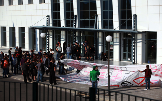 Με αίτημα την απόσυρση του νόμου για την τριτοβάθμια εκπαίδευση οι φοιτητές προχώρησαν σε κατάληψη και αυτή ανάρτησαν στην πρόσοψη ένα τεράστιο πανό.