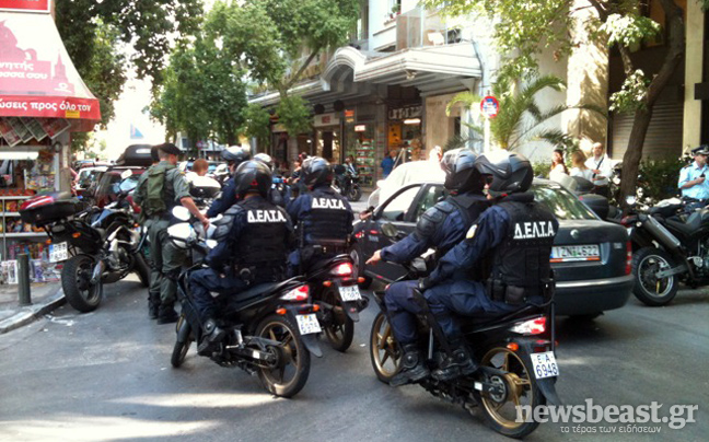 Ισχυρές αστυνομικές δυνάμεις αποτελούμενες από ΜΑΤ και αστυνομικούς της ομάδας Δέλτα έχουν παραταχθεί έξω από το υπουργείο Οικονομικών όπου σε λίγη ώρα αναμένεται να αρχίσει η συνέντευξη Τύπου του υπουργού Οικονομικών Ευ. Βενιζέλου.