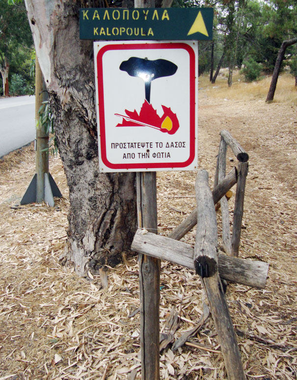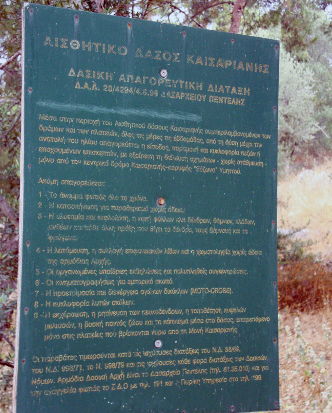 «Προστατέψτε το δάσος από την πυρκαγιά» γράφει η πινακίδα που υπάρχει στο βουνό του Υμηττού προς την Καισαριανή, αλλά η εικόνα που αντικρίζει κανείς μόνο προστασία δεν δείχνει.