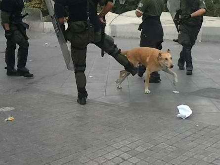 Όπως φαίνεται καθαρά στη φωτογραφία που διέρρευσε στο διαδίκτυο λίγες ώρες μετά το τέλος των διαδηλώσεων και αναρτήθηκε στην προσωπική ιστοσελίδα του σκύλου στο facebook, ο σκύλος των διαδηλώσεων δέχεται κλωτσιά από άνδρα των ΜΑΤ στο Σύνταγμα.