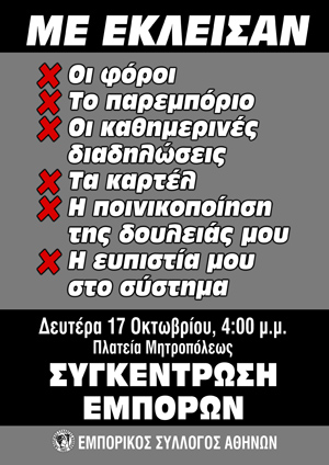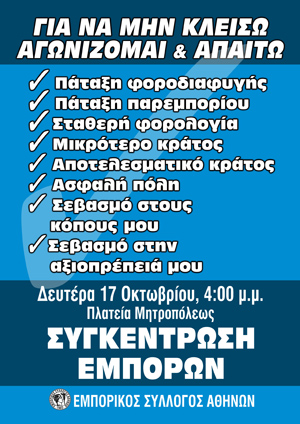 Με μία οργισμένη ανακοίνωση που έχει τίτλο «Το κράτος σε διάλυση, η αγορά και η κοινωνία σε αποσύνθεση» ο Εμπορικός Σύλλογος της Αθήνας καλεί τους εμπόρους να συγκεντρωθούν στις 4 το απόγευμα της Δευτέρας στην πλατεία Μητροπόλεως.