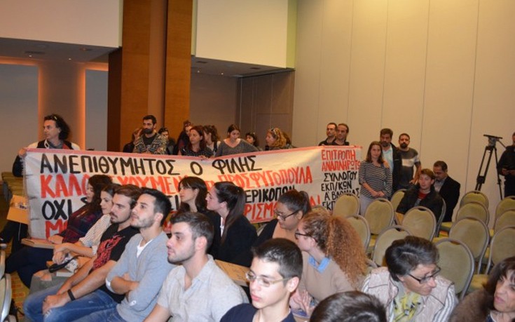 Με συνθήματα και υψώνοντας πανό που έγραφε «Ανεπιθύμητος ο Φίλης καλοδεχούμενα τα προσφυγόπουλα» υποδέχτηκε ομάδα εκπαιδευτικών και φοιτητών τον υπουργό Παιδείας, Νίκο Φίλη, εντός της αίθουσας του ξενοδοχείου όπου πραγματοποιείται το Συνέδριο της Μαθηματικής Εταιρείας.