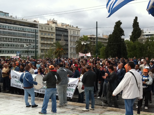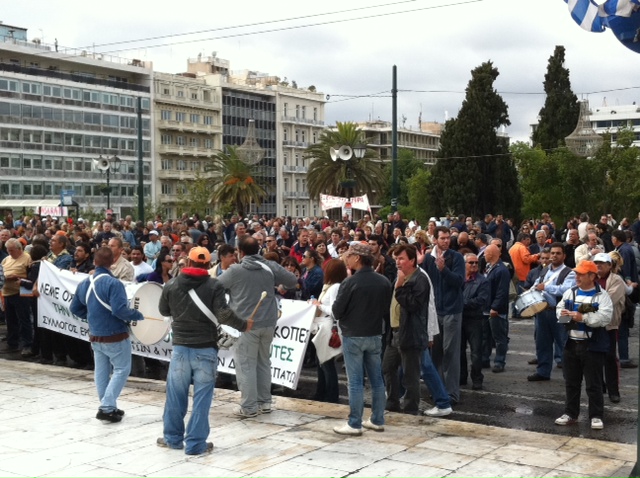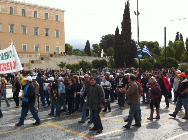 Οι τουλάχιστον 1000 διαδηλωτές πέρασαν από το υπουργείο Οικονομικών και κατέληξαν μπροστά στη Βουλή, όπου τους περίμεναν εκπαιδευτικοί της ΟΛΜΕ και της ΔΟΕ. Στο συλλαλητήριο συμμετέχει και η ΑΔΕΔΥ.