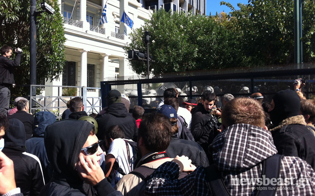Ένταση επικρατεί αυτή την ώρα μπροστά από το φράχτη που έχει στηθεί στη Βασιλίσσης Σοφίας προκειμένου να περιορίσει τους διαδηλωτές μακριά από τη Βουλή.