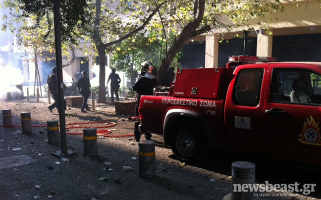 Πριν από λίγο έβαλαν φωτιές σε κάδους σκουπιδιών μπροστά από τα καταστήματα στη Βουκουρεστίου ενώ ο κλεφτοπόλεμος συνεχίζεται στα γύρω στενά.