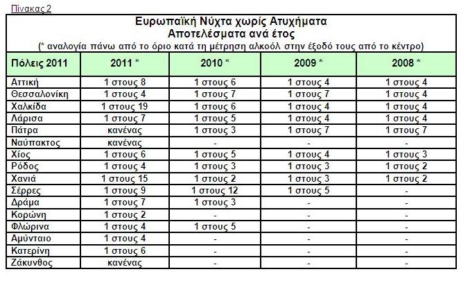 Αξιοσημείωτο είναι το γεγονός ότι στο σύνολο των πόλεων, 1 στους 6 νέους το 2011 που αποτελούσαν τον οδηγό της παρέας βρέθηκαν πάνω από το όριο κατά τη μέτρηση αλκοόλ στην έξοδό τους από το κέντρο ενώ το έτος 2010 η αναλογία αυτή ανερχόταν 1 στους 4 νέους.