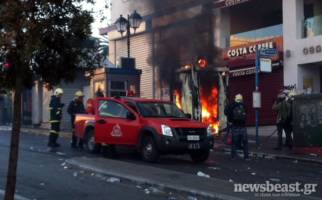 Έπειτα από πολλές ώρες μαχών, συγκρούσεων μεταξύ αγανακτισμένων διαδηλωτών και αστυνομικών δυνάμεων, δεκάδες ρίψεις μολότοφ, φωτοβολίδων, κροτίδων και πολλές εστίες φωτιάς σε αρκετά σημεία του κέντρου, η Αθήνα θυμίζει εμπόλεμη ζώνη.