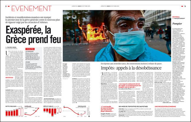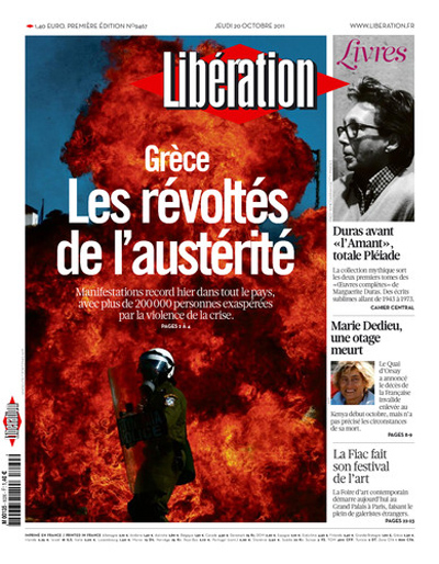 Πρωτοσέλιδο έκανε η γαλλική Libération τις χθεσινές διαδηλώσεις στην Ελλάδα με μία φωτογραφία-φωτιά από τα επεισόδια. «Διαδηλώσεις-ρεκόρ σε όλη τη χώρα με 200.000 άτομα εξοργισμένα από τη βιαιότητα της κρίσης», σημειώνει η εφημερίδα στο πρωτοσέλιδό της περιγράφοντας τη χθεσινή μέρα στην Αθήνα.