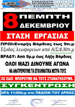 «Οι λεηλασίες της κυβέρνησης δεν έχουν τέλος. Ο αγώνας επιβάλλεται για να τα καταφέρουμε. Όλοι μαζί αντιστεκόμαστε, μονόδρομος ο αγώνας για να τους σταματήσουμε», αναφέρει σε ανακοίνωσή του το συνδικάτο εργαζομένων του ΟΑΣΑ και απευθύνει κάλεσμα συμμετοχής στην απεργιακή συγκέντρωση, στις 11:00 το πρωί της Πέμπτης, στο Πεδίον του Άρεως.