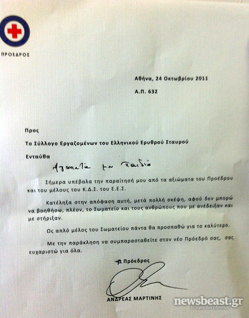 Το αποτέλεσμα ήταν ο κ.Μαρτίνης να υποβάλλει την παραίτησή του από πρόεδρος του Ελληνικού Ερυθρού Σταυρού, γιατί όπως λέει δεν μπορεί να βοηθήσει τους εργαζόμενους.