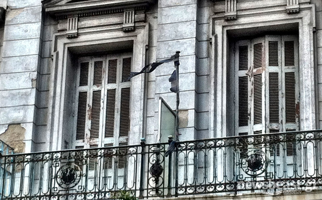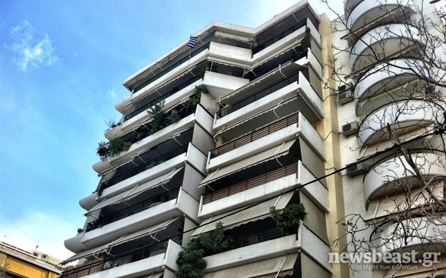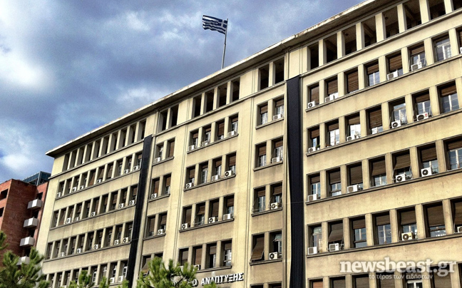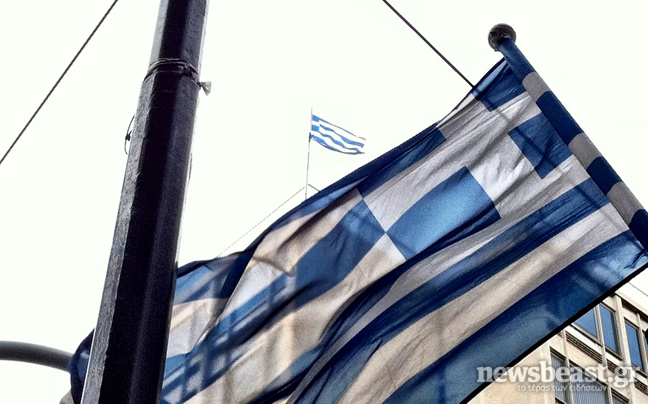 Η ελληνική σημαία κυματίζει στην ταράτσα του υπουργείου Ανάπτυξης, στην πλατεία Κάνιγγος.