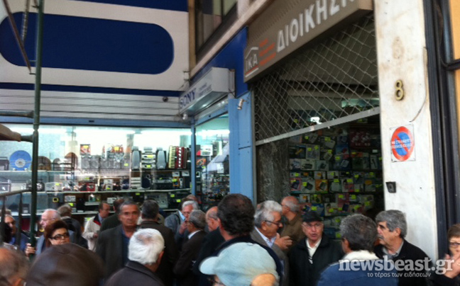 Στα γραφεία της διοίκησης του ΙΚΑ στην Αγίου Κωνσταντίνου είναι συγκεντρωμένοι οι συνταξιούχοι οι οποίοι διαμαρτύρονται για τις περικοπές στις συντάξεις, τα ελλειμματικά αποθεματικά των ταμείων και τα σκληρά μέτρα της κυβέρνησης που τους έχουν γονατίσει.