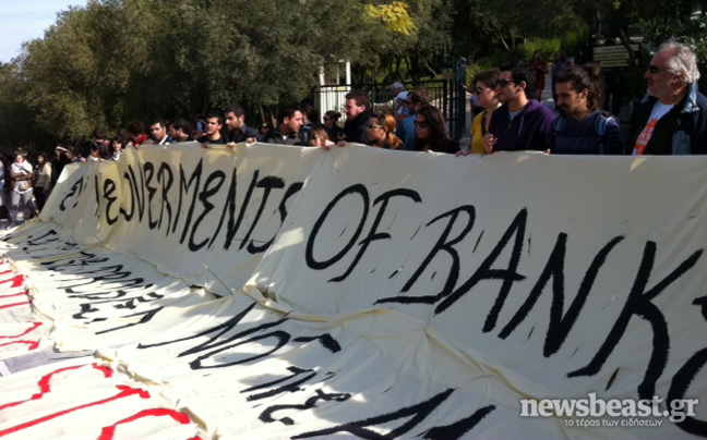 Πενήντα νεαροί της νεολαίας του ΣΥΡΙΖΑ έχουν καταλάβει την Ακρόπολη και έχουν αναρτήσει δύο μεγάλα πανό στα αγγλικά, τα οποία αναγράφουν «όχι στην κυβέρνηση των τραπεζών, η λιτότητα δεν είναι λύση».