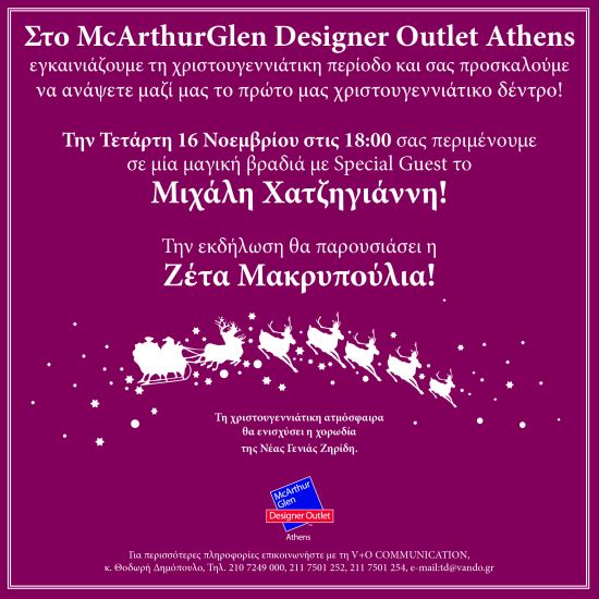 Το εκπτωτικό χωριό McArthurGlen φοράει τα γιορτινά του και εγκαινιάζει τη χριστουγεννιάτικη περίοδο με τον πιο εντυπωσιακό τρόπο, ταξιδεύοντας τους επισκέπτες του στο μαγικό κόσμο των Χριστουγέννων και κάνοντας τους να νιώσουν όλοι και πάλι παιδιά.