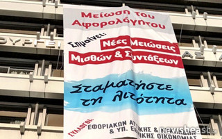 «Σταματήστε τη λιτότητα» γράφει το πανό που κρέμασε νωρίς σήμερα το πρωί στο υπουργείο Οικονομικών ο Σύλλογος Εφοριακών Αττικής.