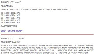 Ενώ ο αρχηγός των Ενόπλων Δυνάμεων της Τουρκίας ήταν στην ίδια αίθουσα με τον Έλληνα ΑΓΕΕΘΑ, η Άγκυρα αμφισβήτησε ευθέως για μια ακόμα φορά την ελληνική κυριαρχία με δύο Navtex. Στην μία με αριθμό 482/17 αναφέρει πως δεν υπάρχει συγκεκριμένη υπηρεσία έκδοσης Navtex για το Αιγαίο και την Μεσόγειο που να έχει εγκριθεί από τους Διεθνής Οργανισμούς ΙΜΟ και ΙΗΟ και ως εκ τούτου η ελληνική Navtex 257/17 δεν είναι έγκυρη και για αυτό οι σταθμοί της Αττάλειας και της Σμύρνης θα συνεχίσουν να εκδίδουν κανονικά Navtex….