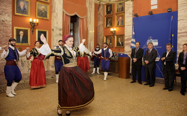 Πρώτος, ο Όμιλος Βρακοφόρων Κρήτης έψαλλε παραδοσιακά κάλαντα και μαντινάδες του νησιού και χόρεψε κρητικούς χορούς με συνοδεία λύρας και λαούτου.