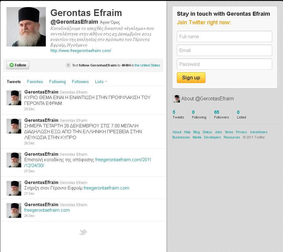 «Καταδικάζουμε το απεχθές δικαστικό «έγκλημα» που συντελέστηκε στην Αθήνα στις 23 Δεκεμβρίου 2011 εναντίον της εκκλησίας στο πρόσωπο του Γέροντα Εφραίμ, Ηγούμενου της Μονής Βατοπαιδίου Αγίου Όρους», σημειώνει στις πληροφορίες της η Ομάδα των υποστηρικτών του.