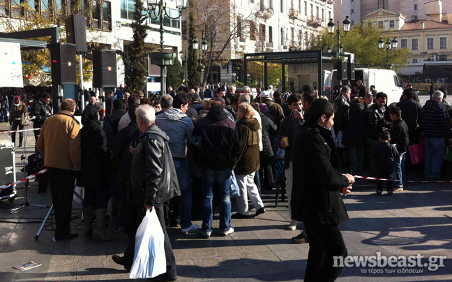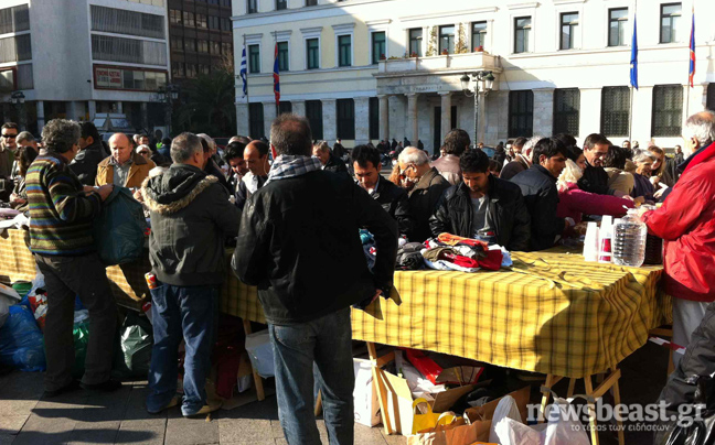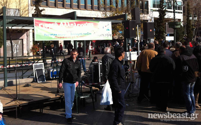 Με κόσμο έχει γεμίσει από το πρωί η πλατεία Κοτζία, μπροστά από το δημαρχείο όπου διοργανώνει Γιορτή Αλληλεγγύης η «Ανοιχτή Πόλη».