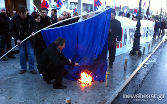 Οι συγκεντρωμένοι, μάλιστα, έδειξαν την οργή τους καίγοντας μια σημαία της Ευρωπαϊκής Ένωσης.