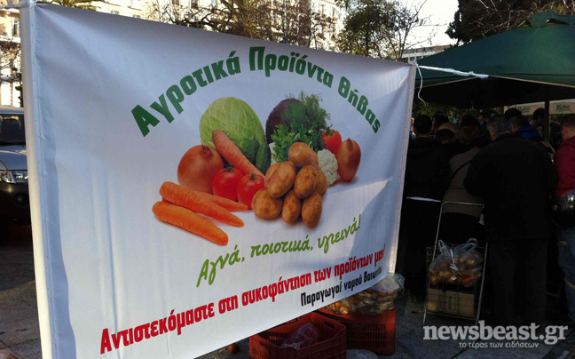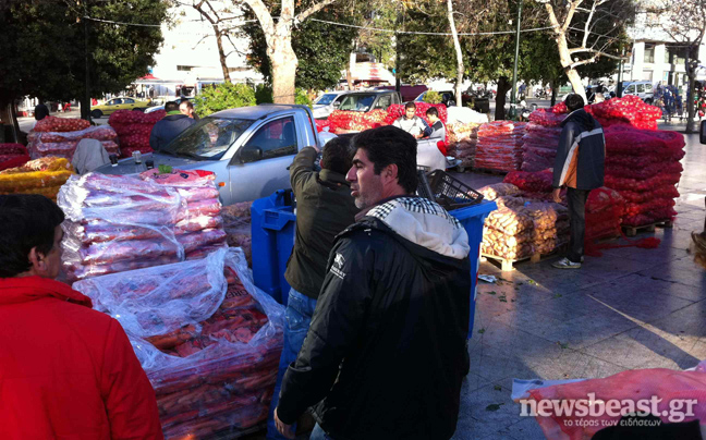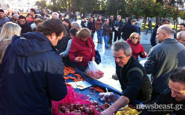 Πλημμύρισε η πλατεία Συντάγματος από 20 τόνους λαχανικών τα οποία οι παραγωγοί της Θήβας δίνουν δωρεάν στους διερχόμενους μετατρέποντας την πλατεία σε λαϊκή αγορά.