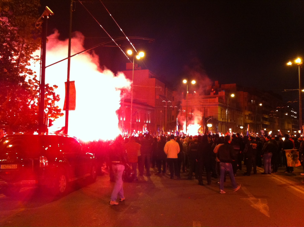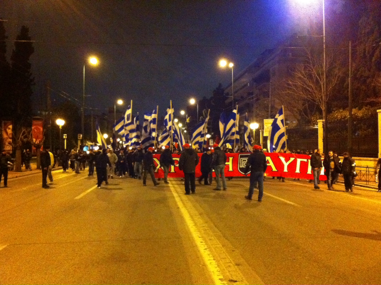 Η παρουσία της αστυνομικής δύναμης που περιφρουρεί την πορεία είναι ιδιαίτερα έντονη. Επικεφαλής της πορείας είναι ο Νίκος Μιχαλολιάκος ενώ εκτιμάται ότι στη συγκέντρωση συμμετέχουν περίπου 2.000 άτομα.