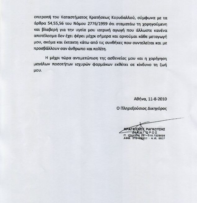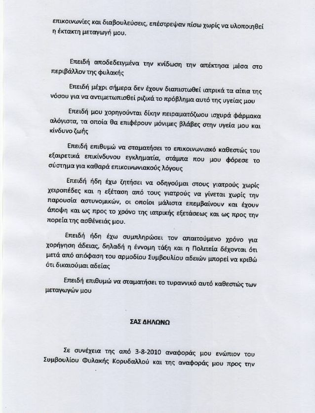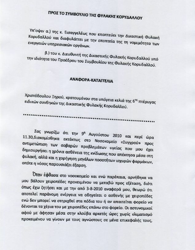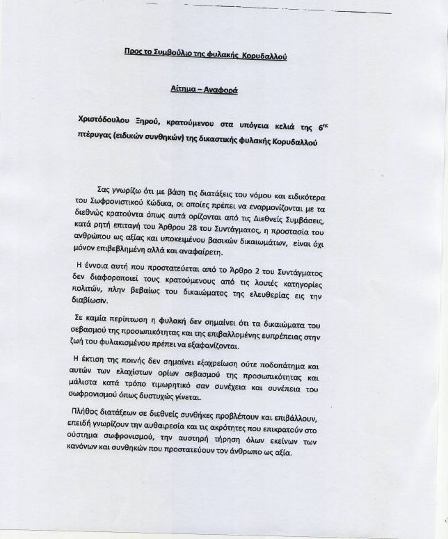 Ο Χριστόδουλος Ξηρός αναφέρει ότι σταματά την ιατρική αγωγή που του χορηγείται. Λέει ότι θα αρνηθεί τη μεταγωγή του και υποστηρίζει ότι τα φάρμακα που του χορηγούνται βάζουν σε κίνδυνο τη ζωή του.