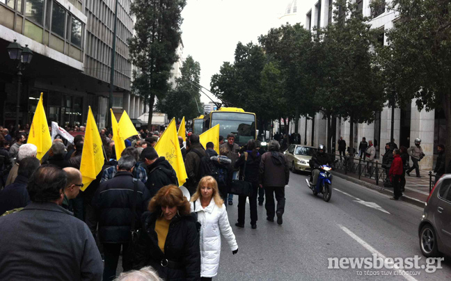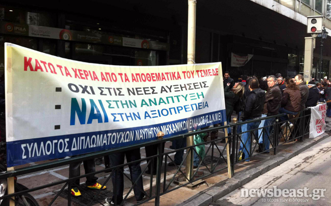 Στο υπουργείο Εργασίας στην οδό Σταδίου βρίσκονται αυτήν την ώρα οι πτυχιούχοι μηχανικοί οι οποίοι διαμαρτύρονται για τις ασφαλιστικές εισφορές και τα χαράτσια.