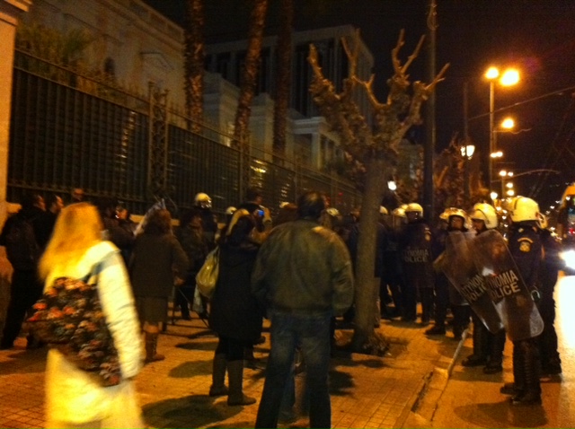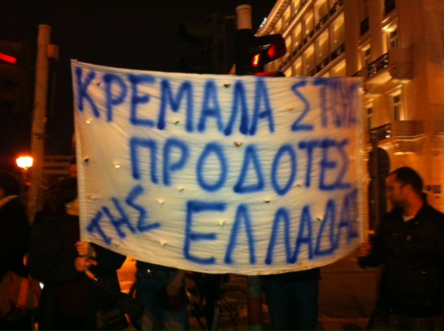Μικρή ένταση επικράτησε πριν από λίγο στην πλατεία Συντάγματος. Ομάδα περίπου τριάντα ατόμων που βρίσκονταν έξω από τα λουλουδάδικα επί της Βασιλίσσης Σοφίας και που κρατούσαν ένα πανό με το σύνθημα «Κρεμάλα στους προδότες», απωθήθηκαν από τα ΜΑΤ στη Λεωφόρο Αμαλίας. Η διέλευση των οχημάτων διεξάγεται αυτή τη στιγμή κανονικά.