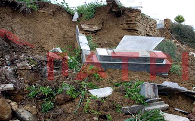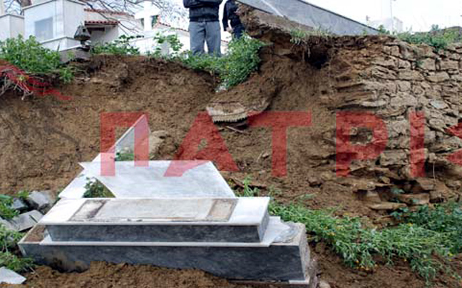 H πρωτοφανής νεροποντή είχε σαν αποτέλεσμα να καταρρεύσει από κατολίσθηση τμήμα του νεκροταφείου και να αποσυντεθούν δυο τάφοι, σύμφωνα με το patrisnews.com. Μάλιστα ανάμεσα στα μάρμαρα και το χώμα, ξεπρόβαλλαν τα φέρετρα καθώς και τα οστά των νεκρών, προκαλώντας απελπισία, αλλά και θυμό στους κατοίκους του χωριού.