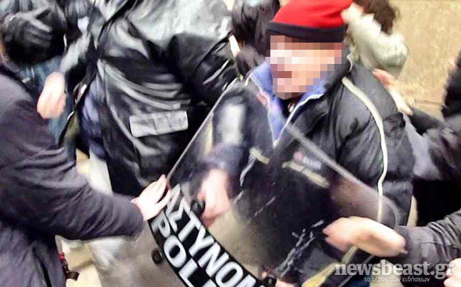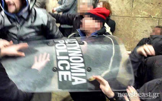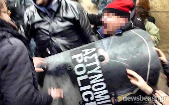 Αίσθηση προκάλεσε και η φωτογραφία που κυκλοφόρησε στο twitter και δείχνει μία ασπίδα των ΜΑΤ στα χέρια διαδηλωτή την ώρα της έντασης.
