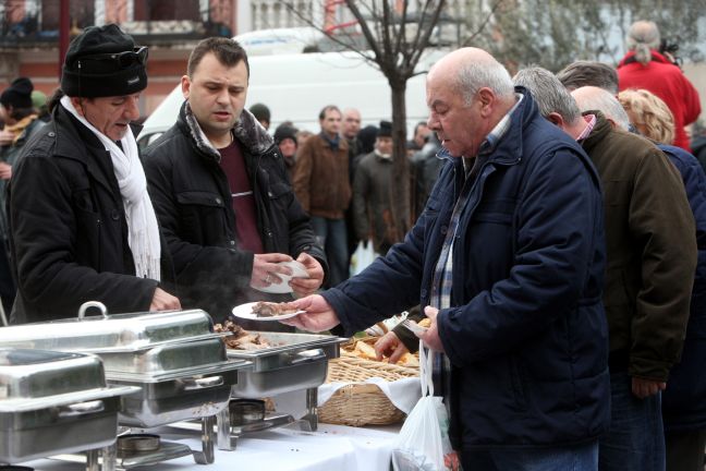 Φέτος, όπως και τις περισσότερες χρονιές, λόγω Τσικνοπέμπτης, οι κρεοπώλες μοίρασαν σήμερα 1.000 κιλά κρέας και 200 κιλά κρασί για τους ανθρώπους που, εξαιτίας της οικονομικής στενότητας που αντιμετωπίζουν, αδυνατούν να γιορτάσουν την ημέρα με τον πατροπαράδοτο τρόπο. Γι’ αυτό και η σημερινή προσφορά κρεάτων από τους κρεοπώλες είχε σήμερα τη μορφή συσσιτίου.