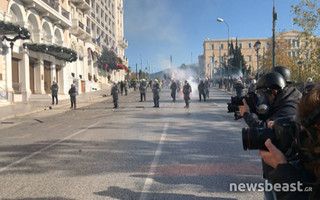 Μόλις η πορεία πλησίασε στην πλατεία Συντάγματος, μια μικρή ομάδα κουκουλοφόρων στη θέα των ΜΑΤ ξεκίνησε να πετάει πέτρες και μολότοφ προς τις αστυνομικές δυνάμεις.