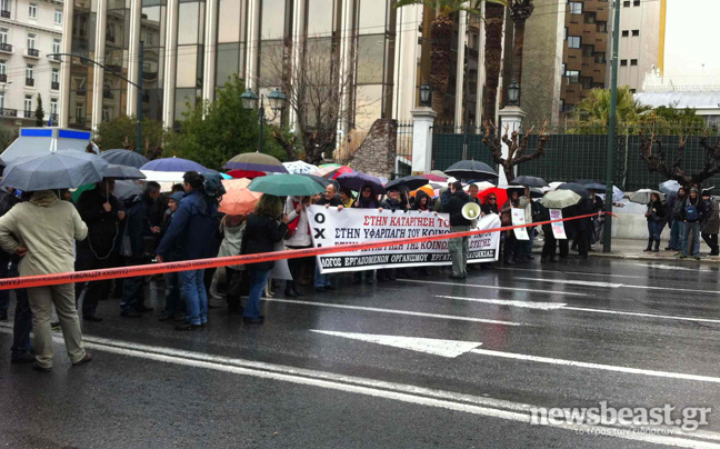 Οι εργαζόμενοι έχουν συγκεντρωθεί έξω από τη Βουλή και φωνάζουν συνθήματα.