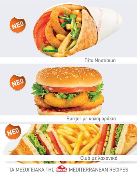 Τα Μεσογειακά της Goody’s επανέρχονται δυναμικά, με νέες απολαυστικές συνταγές: Burger με καλαμαράκια, Club με ψητά λαχανικά, Νηστίσιμη πίτα με onion rings αλλά και τα all time classic: Γεύματα Μεσογείου με γαρίδες ή καλαμαράκια, Μεσογειακό Σάντουιτς με ψητά μαριναρισμένα λαχανικά, Χωριάτικα Σάντουιτς, μακαρονάδες Goodissimo με γαρίδες ή θαλασσινά και δροσερές σαλάτες Κρήτης και Αιγαιοπελαγίτικη!