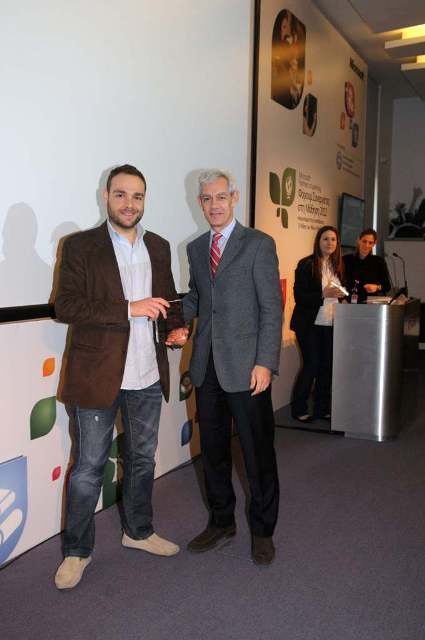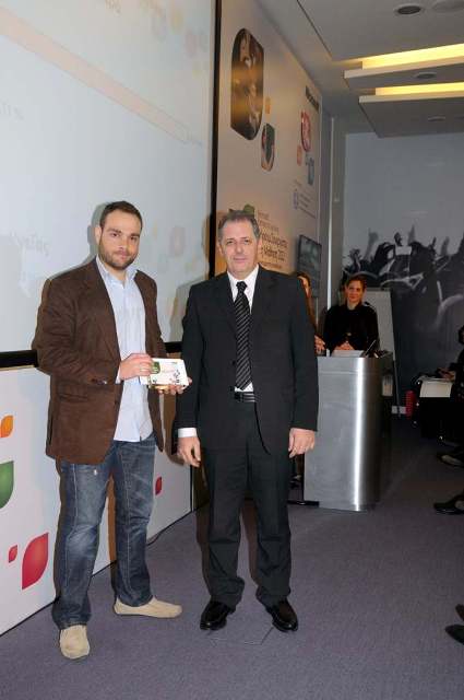 (O κ. Μάρκος Χατζητάσκος (αριστερά) και o κ. Κωνσταντίνος Δημητρίου (δεξιά) από το Λύκειο Κολλεγίου Ψυχικού παραλαμβάνουν το βραβείο για την τρίτη θέση από τον κ. Φώτη Δραγανίδη, Διευθυντή Ακαδημαϊκού Τομέα της Microsoft Ελλάς και την κα Έλενα Ζαγλαρίδου, Υπεύθυνη Εκπαιδευτικών Προγραμμάτων της Microsoft Ελλάς)