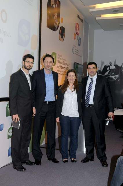 (Από αριστερά ο κ. Κωστής Δούκας, Διευθύνων Σύμβουλος και Διευθυντής Λυκείου, Εκπαιδευτήρια Δούκα, ο δρ. Νικήτας Καστής, Διευθυντής Ιδρύματος Λαμπράκη, η κα Έλενα Ζαγλαρίδου, Υπεύθυνη Εκπαιδευτικών Προγραμμάτων της Microsoft Ελλάς, ο κ. Νίκος Φέκος, Διευθυντής Τεχνολογίας του Ελληνοαμερικανικού Εκπαιδευτικού Ιδρύματος και ο κ. Φώτης Δραγανίδης, Διευθυντής Ακαδημαϊκού Τομέα της Microsoft Ελλάς)